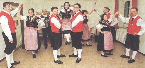 Bestehen, das am Samstag begangen wird. —Foto: SILKE KELLER-THOSS Bei dieser Feier entstand die Idee einer Neuauflage. „Wir sprachen Ilse Weidlich an und auch Lothar Weller, der uns über viele Jahre mit dem Akkordeon begleitete“, erinnert sich Roth der ersten Proben im Sportlerheim. Weitere Jugendliche konnten zum Mitmachen überzeugt werden, so dass die Gruppe 1993 unter dem Dach des damals sehr aktiven Heimatvereins Bergen mit vier Paaren ihre ersten Tanzschritte machte. Ihren ersten einstudierten Tanz, den „Schnedderedeng“, führten die jungen Leute bei der Veranstaltung das Bergener Heimatvereins „Musikalische Reise durchs Land“ im Mai 1993 in der Turnhalle auf. „Das war nicht einfach. Wir mussten die Tanzschritte und Choreographie lange üben. Aber es war eine schöne Zeit“, denkt Angela Roth zurück. In den Folgejahren bestritt das Ensemble zahlreiche Veranstaltungen mit, unter anderem bei Heimatveranstaltungen in Trieb-Schönau, bei Straßenfesten, in Krankenhäusern sowie bei den Tagen der Vogtländer und Sachsen. 1994 zogen sie neue, vom Textilwerk Klingenthal hergestellte Trachten an. Seit März 2001 tritt die Trachtenganzgruppe Bergen als eigenständiger gemeinnütziger Verein auf. Ihr Repertoire konnte sie bedeutend erweitern. Neben dem „Schnedderedeng“, ihrem Standard-Tanz, tragen die Tanzpaare vogtländische Rundas, die Altvogtländische Polka, den Dreher aus Wildenau, den Vogtlandwalzer, den Galopp aus dem Wiedersberger Tanzbuch und einen Bändertanz vor. Außerdem beherrschen sie neue Tänze und Tänze aus anderen Regionen, wie das „Holsteiner Dreitor“, einstudiert von Jens Holler, einem Volkstanzprofi aus Flensburg, der 2000 zum Ensemble stieß. Oft wurde die Gruppe bei ihren Auftritten von den Harzberg-Musikanten, der Bergener Sängerin Kerstin Heisler und der Trompeterin Manuela Lange begleitet. Eine unersetzbare Lücke entstand in der Tanzgruppe 2001 durch den Tod von Lothar Weller. Heute bestreiten die Tänzer viele ihrer Auftritte mit dem Heimattrio Theuma. In den zehn Jahren wechselten etliche Mitglieder. Angela Roth und Diana Ebert hielten von der Gründung bis heute zur Stange. Obwohl etliche Mitglieder ihren Berufen in ganz Deutschland nachgehen, wird die Probenarbeit aller zwei Wochen von allen wahrgenommen. Einen Rückblick auf 10 Jahre Trachtentanzgruppe Bergen gibt das Ensemble am 24. Mai im Bergener Sportlerheim, wozu alle Ehemalige, Mitwirkende und Helfer eingeladen sind. (güli)