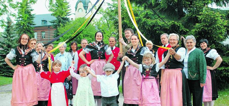 | Von Margitta Rosenbaum Bergen. Die Trachtentanzgruppe Bergen hat Grund zum Feiern: Mit wechselnder Besetzung besteht sie nun schon seit 15 Jahren. Anlässlich dieses Jubiläums trafen sich die Vereinsmitglieder nach ihrem Auftritt in Plauen beim Tag der Vogtländer in Bergen. Geprobt wird einmal im Monat in der alten Schule Bergen. Für Auftritte und weitere Proben hat sich inzwischen eine gute Zusammenarbeit mit einer Tanzgruppe aus Zwickau entwickelt. Die aktiven Mitglieder der Gruppe fahren montags nach Zwickau, wo man gemeinsam die Tänze einübt. Anja Fischer ist die einzige aus der Gruppe, die schon von Beginn an dabei war und heute noch mit auftritt. Zu Anfang wohnte sie in Poppengrün, nun lebt sie in Plauen. Obwohl der Verein in Bergen beheimatet ist, wohnt nur noch ein Mitglied in dem Ort. Es ist Käthe Baumann, die gute Seele des Vereins. Die 84-Jährige kümmert sich liebevoll um die Trachten, um den Raum zum Treffen und die vielen organisatorischen Kleinigkeiten. Die Vorsitzende des Vereins ist Sabine Wunderlich aus Kottengrün. Sie bringt oft ihre Enkelkinder mit, die besonders bei den Rundatänzen gerne mitmachen. Angefangen hatte es vor 15 Jahren zum 725-jährigen Jubiläum von Bergen. Für den Umzug hatte man alte vogtländische Trachten zusammengetragen. Als das Fest vorbei war, befand man, dass diese Trachten zu schade sind, um für die nächsten Jahre wieder in Kisten auf dem Boden zu verschwinden. Junge Leute sollten wieder darin tanzen. Mit vier Paaren startete die Gruppe. Die Leitung liegt bis heute in den Händen von Ilse Weidlich aus Falkenstein, die für das Einstudieren zuständig ist. Sie hatte in den 1960er Jahren im damaligen Bekleidungswerk schon einmal eine solche Gruppe angeleitet. Dafür hat sie alte Volkstänze ausfindig gemacht. Getanzt wird vorwiegend zu den traditionellen vogtländischen Weisen. Neben überlieferten Tänzen hat man sich auch daran gemacht, zu den alten Melodien neue Tänze zu gestalten. Galopp und Polka werden neben den Rundatänzen am meisten aufgeführt. In den ersten Jahren wurde die Tanzgruppe von Lothar Weller, der 2001 verstarb, auf dem Akkordeon begleitet. Etliche Musikstücke hat er noch auf eine CD eingespielt. Nun ist die Gruppe auf der Suche nach einem Akkordeonspieler, der bei den Proben und Auftritten für die Musik sorgt. Inzwischen hat der Verein 16 Mitglieder. Die alten Trachten reichten bald nicht mehr aus. Es mussten neue angefertigt werden. Die vogtländische Tracht besteht aus der bestickten Buckelhaube, Strickstrümpfen in weiß oder blau, dem weißen Unterrock, schwarzem Rock und Mieder sowie der weißen Bluse, der Schürze und einem Tuch. Die Männer tragen ein weißes Hemd mit schwarzer Schleife und rote Westen. Nicht alle Vereinsmitglieder können sich noch aktiv an den Auftritten beteiligen. Manche mussten aus beruflichen Gründen weit wegziehen. Aber zur Geburtstagsfeier am Samstag waren alle gekommen und einige Ehemalige dazu. Einige Mitglieder der Harzbergmusikanten spielten auf, damit die Tänzer ihrem Hobby auch beim eigenen Fest nachkommen konnten.