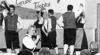 | Von unserer Mitarbeiterin Christine Hensel HARTMANNSGRÜN. „Grüße aus dem Triebtal“ überbrachte am Samstag nachmittag der Heimatverein Trieb/Schönau den Heimatfreunden in der Gemeinde Hartmannsgrün. Eingeladen hatte der Heimatverein „Holzbachtal“. Der Verein hatte im Ortsteil Pfaffengrün die Turnhalle, den Kultursaal der Gemeinde, auf Hochglanz gebracht. Niemand wollte sich das musikalische Stelldichein mit den benachbarten Heimatfreunden entgehen lassen, zumal Kaffee und frischer Kartoffelkuchen lockten. Die Gastgeber hatten sich auch als Bäcker bewährt. Belegte Brötchen für den deftigen Hunger balancierten die Gastgeber auch durch den Saal. Schließlich forderten die Trieber auch kräftiges Mitmachen beim Singen, Schunkeln und Klatschen. Die Tische im Saal trugen weiße Tafeltücher. Blumen zierten die Festlichkeit. Schon eine halbe Stunde nach Eröffnung durch die Vorsitzende des gastgebenden Vereins, Regina Heckel, gab es ein Stimmungshoch. Alle sangen, schunkelten und klatschten. Moderator Siegmar Lippold vom Heimatverein Trieb/Schönau mußte nach der ersten Programmpause gar nicht erst zum Mitmachen auffordern. Das freute niemanden mehr als die Gastgeber, die sich mit dieser Veranstaltung auch Anregungen für die eigene Arbeit im Heimatverein „Holzbachtal" versprechen. Der Verein wurde 1991 gegründet, kann aber noch nicht, so ließ Regina Heckel wissen, auf Musik-und Tanztalente in den eigenen Reihen zurückgreifen, die derartige Veranstaltungen ermöglichen würden. Innerhalb des Vereines hat sich nach langem Engagement immerhin ein Chor etabliert, der aber noch Männerstimmen sucht. Chorleiter ist Heinz Zeitler. Der Verein zählt 36 Mitglieder, und im Chor singen derzeit zwölf Frauen. Eine kleine Musikgruppe im Nachwuchsbereich, das sind Kinder aus Hartmannsgrün und Pfaffengrün, die ein Instrument erlernen, festigen die Arbeit des Heimatvereines, Regina Heckel: „Wir sehen unsere Aufgabe in der Pflege von Brauchtum und Tradition. Uns genügen kleine Schritte.“ Der Verein hat in diesem Jahr noch zwei Veranstaltungen geplant: Am 14. November die Rentnerweihnachtsfeier und am 16. November ein Treffen mit Heimatfreunden aus Treuen. Den musikalischen Auftakt am Mit von der heimatverbundenen Partie waren in Pfaffengrün auch Gerhard Müller, Stefanie Beulitz und eine Kindergruppe, die mundartliche Sketche bot. Die Trachtentanzgruppe aus Bergen setzte farbenfrohe Akzente in der Pfaffengrüner Turnhalle. Foto: Poller |
